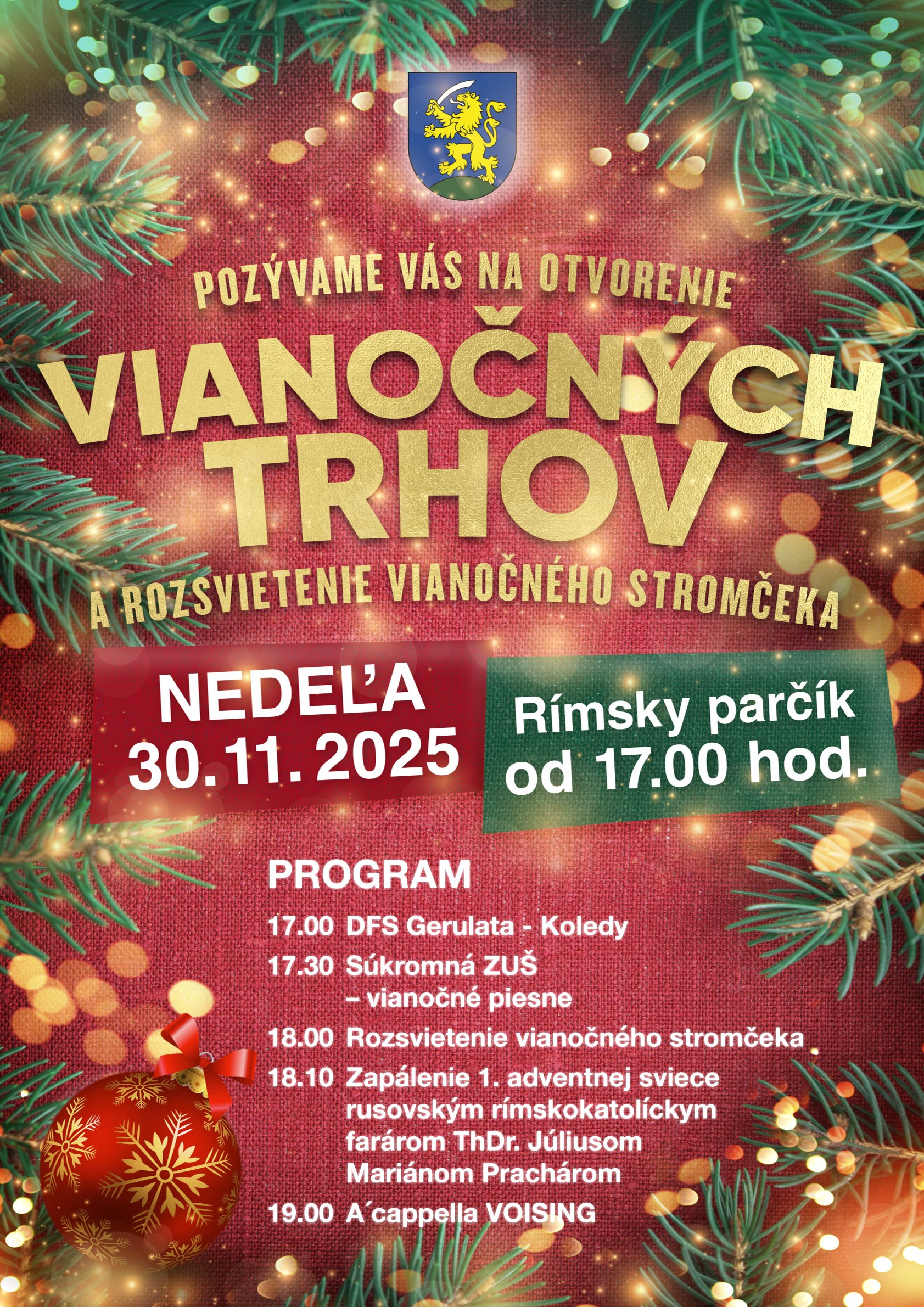 viac >>Milí Rusovčania, pozývame vás na slávnostné otvorenie Vianočných trhov, počas ktorého bude zapálená I. adventná svieca a rozsvietený vianočný stromček, ktorý bude zdobiť náš Rímsky parčík počas celého adventu.