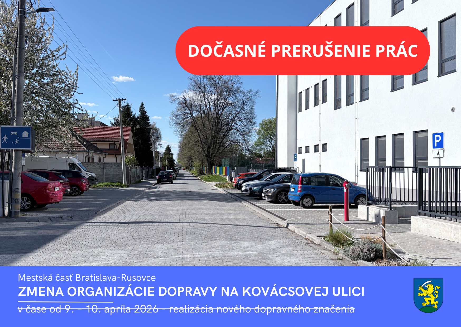 viac >>Vážení obyvatelia, mestská časť Bratislava-Rusovce vás informuje, že od 9. 4. 2026 sa začne realizácia nového dopravného značenia na Kovácsovej ulici (v úseku od križovatky Kovácsova – Vývojová po koniec ulice smerom na Jarovce).