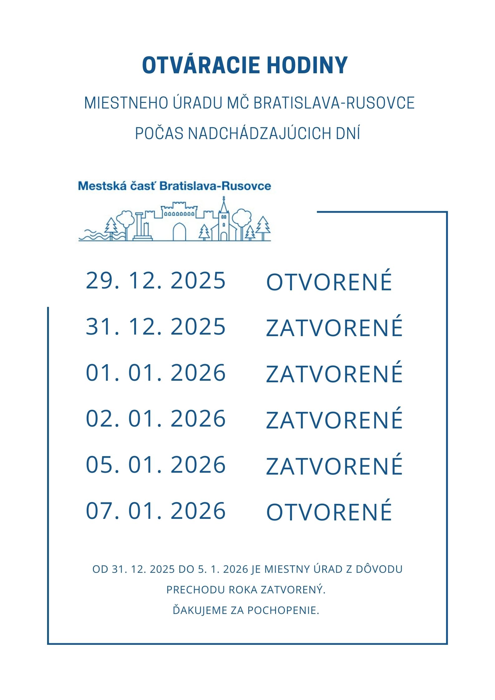 Oznamujeme Vám, že z dôvodu prechodu roka bude miestny úrad v období od 31. 12. 2025 do 5. 1. 2026 zatvorený. Ďakujeme za pochopenie.