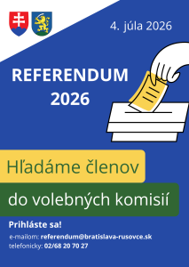 V súvislosti s pripravovaným referendom vám ponúkame možnosť stať sa členom okrskovej komisie. Referendum sa uskutoční v sobotu 4. 7. 2026 v čase od 7:00 do 22:00 hod.