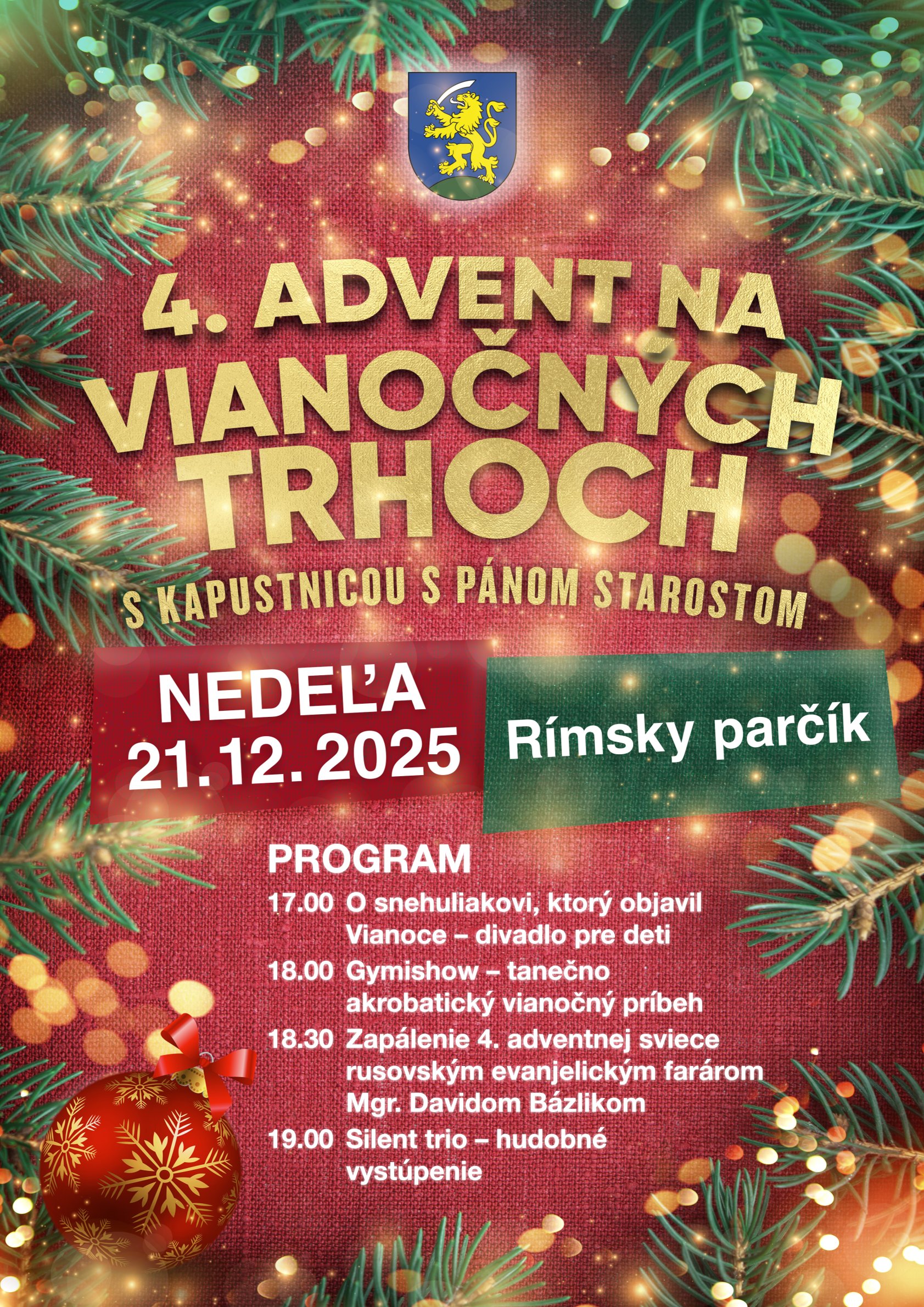 Pozývame vás v nedeľu 21. 12. 2025 na 4. advent na Vianočných trhoch do Rímskeho parčíka. Program začína o 17.00 hod.